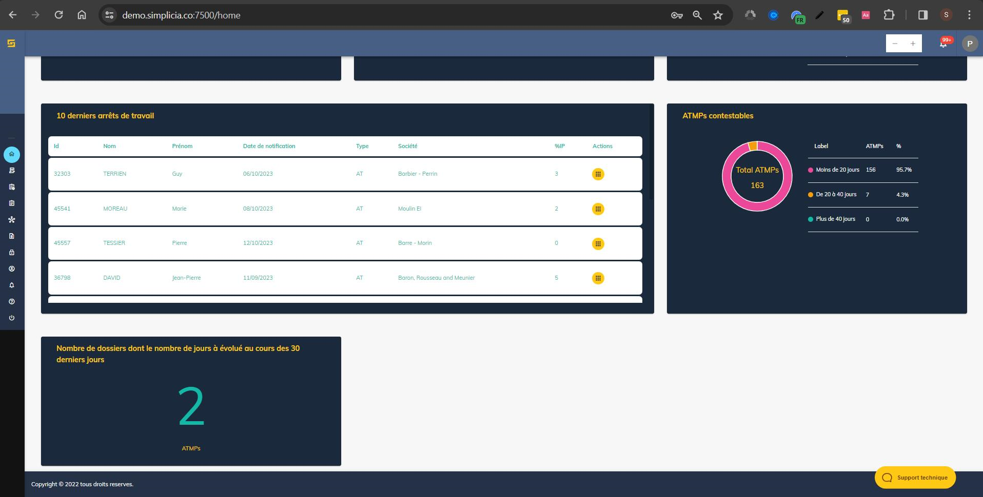 Sous les trois graphiques existants, nous avons ajouté une section qui affiche la liste des 10 derniers ATMP téléchargés. Les colonnes disponibles sont : Nom, Prénom, Société, Date de notification, Type et IP%. Pour économiser de l'espace, nous avons combiné les boutons d'action en un seul bouton, comme nous l'avons fait pour DAT. La largeur de cette carte est équivalente à deux des cartes que nous avons déjà sur le tableau de bord.