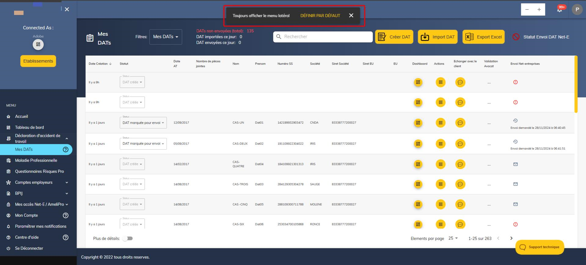 - Les tableaux de bord DAT, ATMP et IJSS existants sont désormais affichés sur cette page avec un agencement clair et une taille optimisée