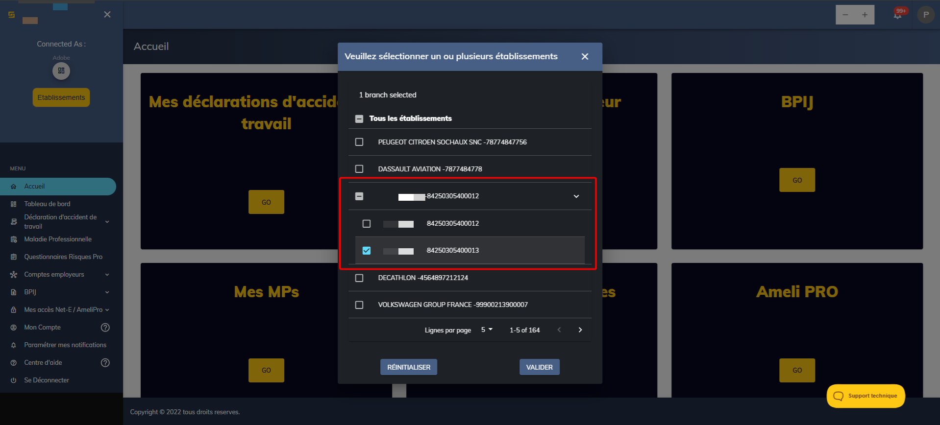 - Lorsque le SIRET principal est sélectionné, les sous-sirets accessibles à l'utilisateur s'affichent sous une structure hiérarchique claire.