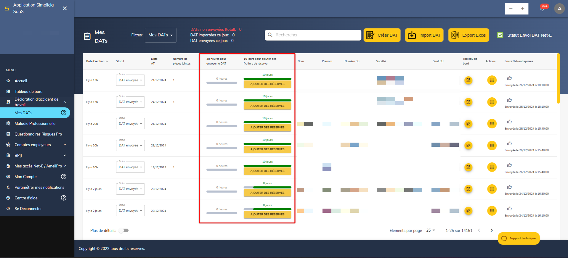 Rouge et ligne en gras si la DAT n’a pas été envoyée.