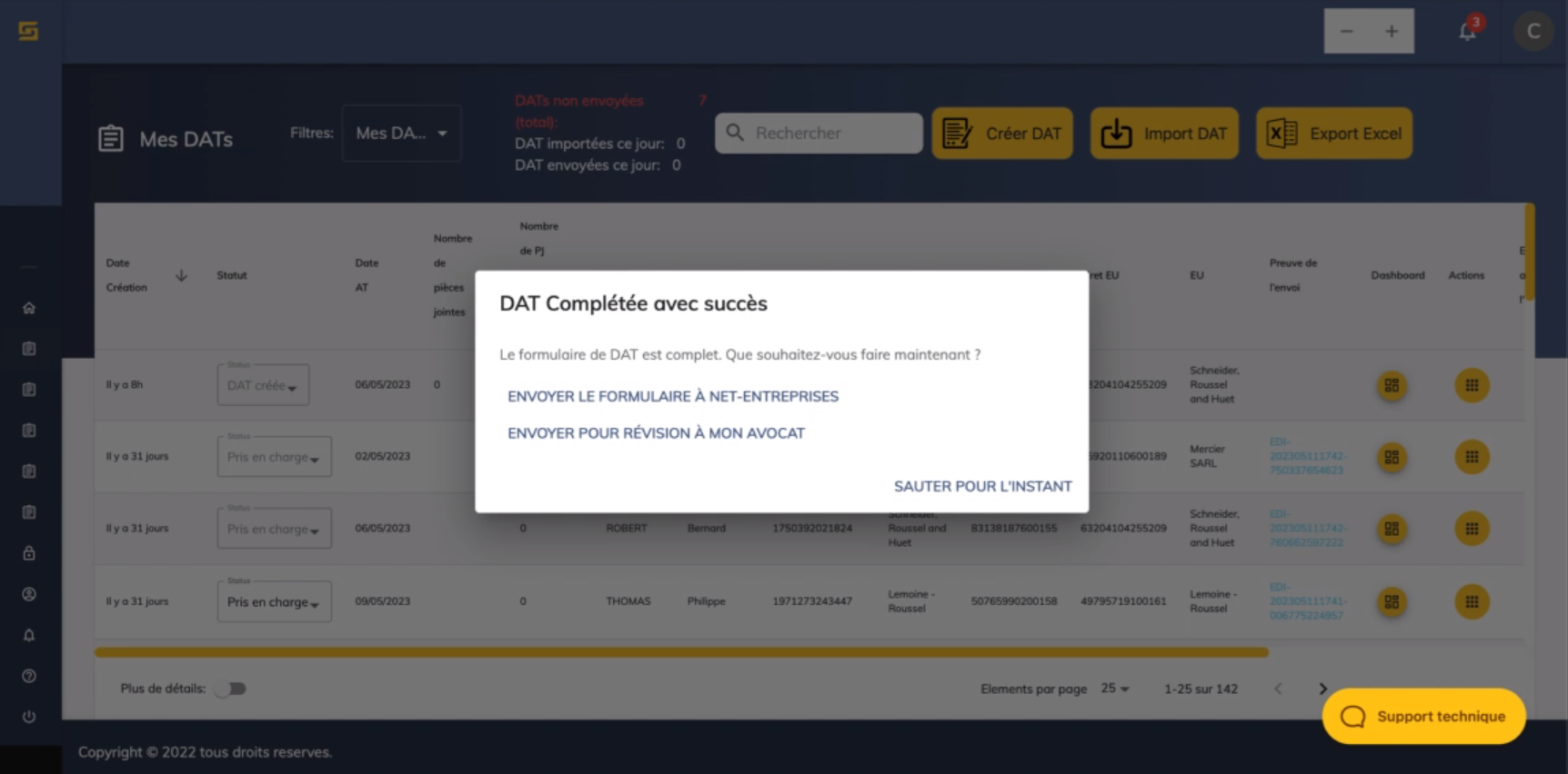 Désormais, lorsque vous remplirez un formulaire DAT et que vous cliquerez sur le bouton de validation, un message contextuel s'affichera pour vous proposer différentes options d'action.